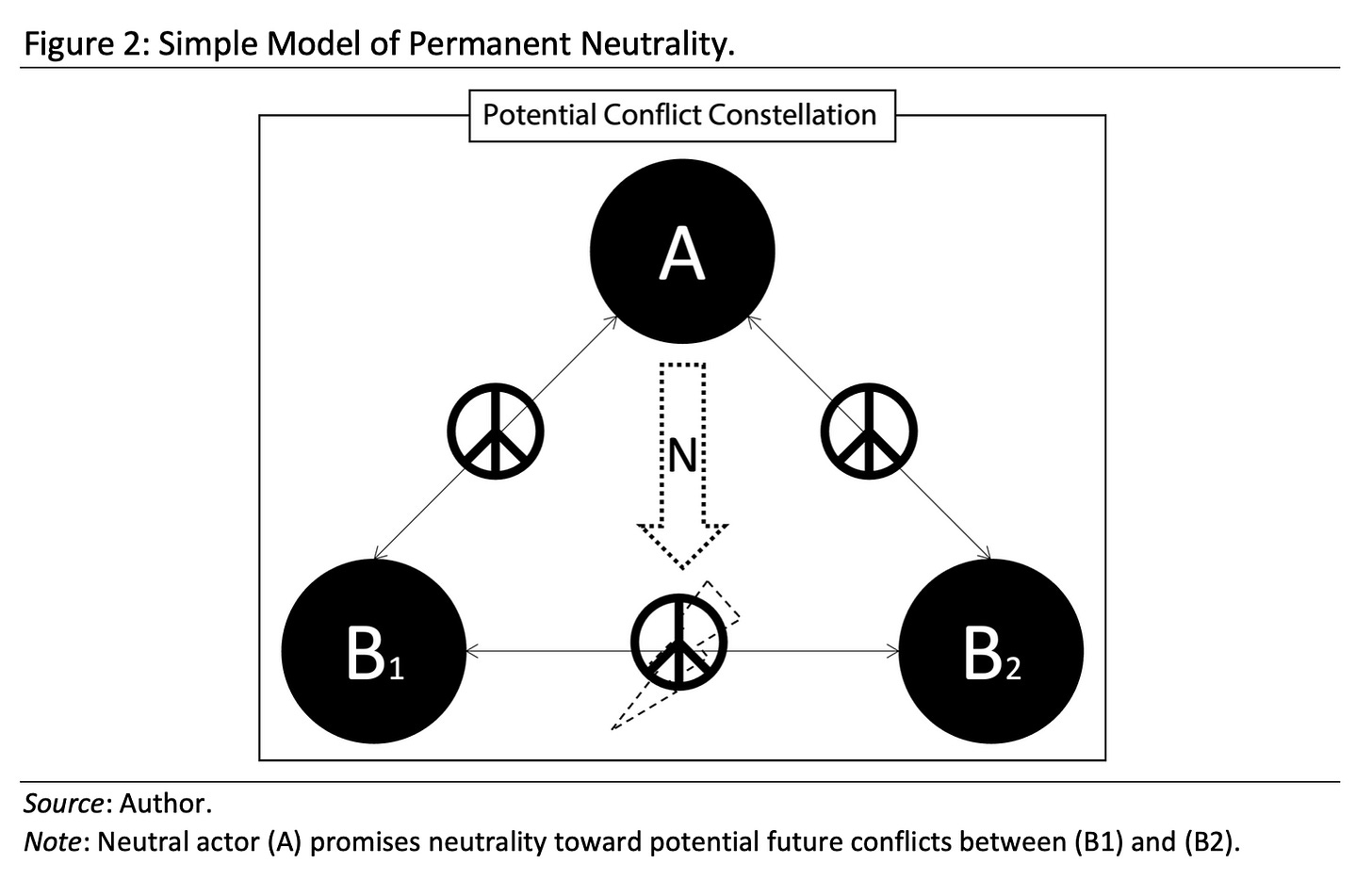 For the sake of simplicity, we will assume that the situation in Figure 1 depicts a classic interstate war. We will call third-party (A) the “neutral actor,” while calling the conflict parties “belligerents” (B1, B2). The essential part of the conflict dynamic—the one that the mental model of in-betweenness hides—is that each party in such circumstances maintains two relationships with each one of the other parties. (B1) and (B2) find themselves by definition in an “at-war” relationship with each other, while both of them maintain an “at-peace” relationship with (A), resulting in a total of three separate relationships. This triangular situation is the logical prerequisite for any neutrality to occur in the first place. Without a third party (A), there would be no actor to be neutral, and without a war, actor (A) would have nothing to be neutral toward (the next section will deal with the case of peace-time permanent neutrality). There are several important aspects to note about this model and its representation: