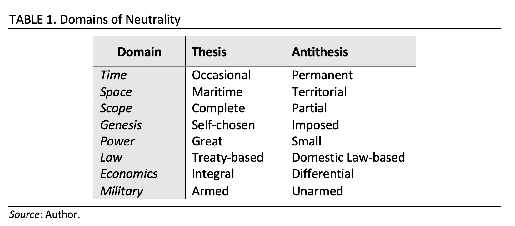 This is not to claim that all neutral actors or instances of neutrality in the international system are the same. Of course, every historical neutrality has its very own case-specific characteristic. Furthermore, depending on where a neutral actor appears and how it behaves, neutralities are often differentiated by the use of various descriptive qualifiers that capture some fundamental aspect of that neutrality. Descriptive qualifiers often cover a specific domain in which neutrality occurs and stand in antithesis to their respective opposites (albeit some domains are spectrums rather than binaries). The most common qualifiers are listed in Table 1.