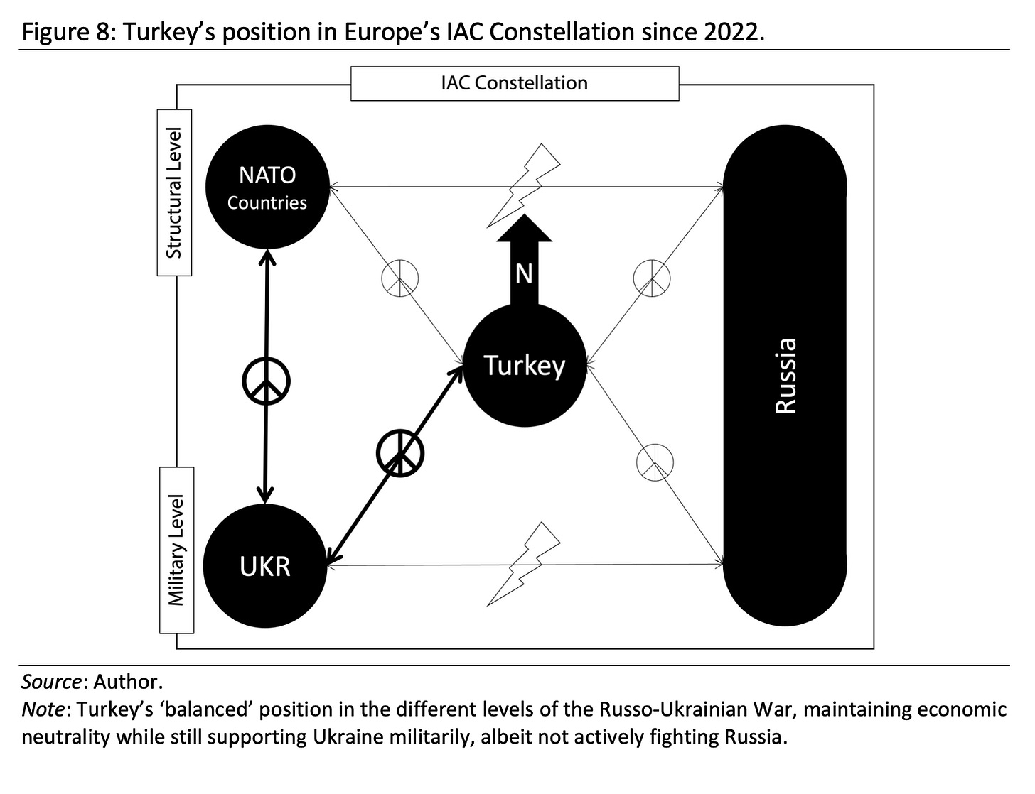 In addition to accepting Turkey as a mediator, Russia also refrained from including Turkey on its list of unfriendly countries (a list on which European neutrals like Switzerland, Austria, and Ireland figure prominently), indicating again that Ankara’s stance toward the structural conflict is what to Russia matters more than direct or indirect support of the hot shooting war in Ukraine.[62] This episode exemplifies that when third parties—even those inside military alliances—maintain some form of equidistant policy toward one or the other level of a conflict, the conflict parties might view them as sufficiently friendly to accept them as neutral in the analytical sense of our third-party actor models. In this case, it was Turkey’s dual engagement; the military support to Ukraine on the one hand, while economically continuing interactions with Russia, that struck the balance needed to be deemed trustworthy enough by both sides.[63] Figure 8 depicts this situation.