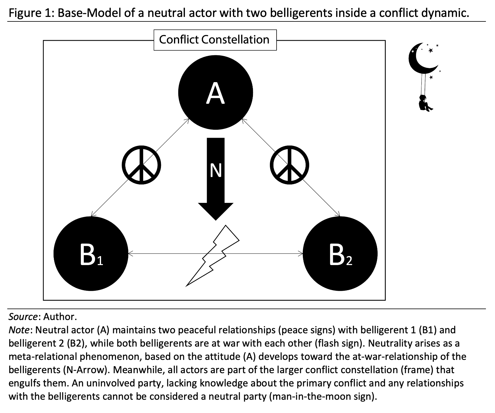 On the other hand, using an overall conflict dynamic as a framework also allows us to draw an outer boundary of the conflict system. This matters mostly regarding the conceptual understanding of the prerequisite for a neutral actor to count as such. To explain this, consider the position of the fourth (hypothetical) actor, indicated in Figure 1. Let us call this actor the “man in the moon,” to create the following thought experiment: Suppose that the man in the moon existed as a real being but was located on the far side of the moon, the side never facing Earth, always looking out into the universe. The man in the moon has never heard of Earth, of humans, or of their social interactions. He does not know humans are grouping themselves into nation states, and he does not know that they fight wars with each other. The man in the moon has neither knowledge of nor a relationship with anyone on this planet. If we now suppose that a war breaks out between two countries on earth, the man in the moon, by virtue of lacking all information about them and their at-war-relationship, would have naturally no position on the war, which would make him superficially appear as “neutral” like (A). However, as he lacks a relationship with either belligerent and knowledge about their at-war-relationship, he does not count as a neutral actor in the sense of this model. While this definition might seem arbitrary, it is hard to imagine that a competent speaker of the English language would identify the man in the moon as a “neutral party”, since the aspect of being “a party to the system” is completely lacking. Some form of knowledge about the belligerents and their war seems required for us to meaningfully ascribe “neutrality” to a third party, which the base model takes into account.
