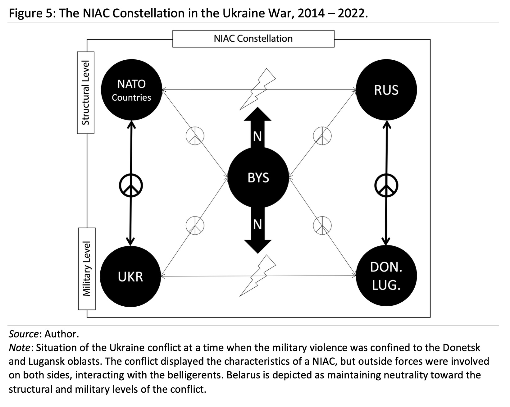 On a first (local) level, the Russo-Ukrainian War contains a conflict between Ukraine’s central government and opposition forces in the two eastern oblasts of Lugansk and Donetsk. Especially between 2014 and 2022, before the large-scale intervention of Russia in what it calls a Special Military Operation. The NIAC Constellation included a large number of actors. On the one hand, the Ukrainian Government received significant diplomatic support from Western states, especially Germany and France, while also receiving military training and aid from other NATO states, especially the USA and the UK.[51] On the other hand, Russia provided extensive diplomatic and military support to the two breakaway oblasts. The most neutral position in this constellation was taken by Belarus,[52] which in the first years of the conflict managed to maintain a working relationship with all parties and consequently even function as the host of the “Minsk Agreements” (named after the Belorussian capital) that were negotiated in 2014 and 2015, to bring the conflict to a political settlement. Hence, we can position Belarus as the pivotal neutral state ‘in the analytical sense’ in the center of the model to investigate its relationships and neutral attitudes toward the two different levels in which the conflict was playing out.