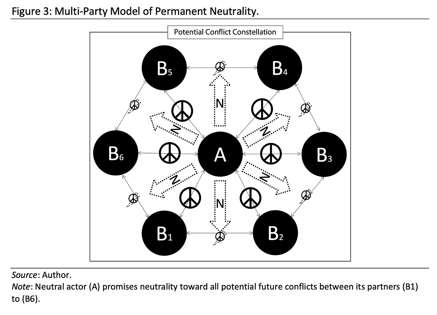 Especially in the context of permanent neutrality, it is worth pointing out that the base model and its derivatives are merely simplifications of actual constellations. In the real world, the number of actors and relationships is naturally much larger and hence more complex. Also, Permanent neutrals must be understood as maintaining the same promise of future non-involvement toward all potential theaters of war. Hence, a more realistic depiction of the permanent neutral’s predicaments puts it in the center from where a multitude of triangular relations emerge, as shown in Figure 3.