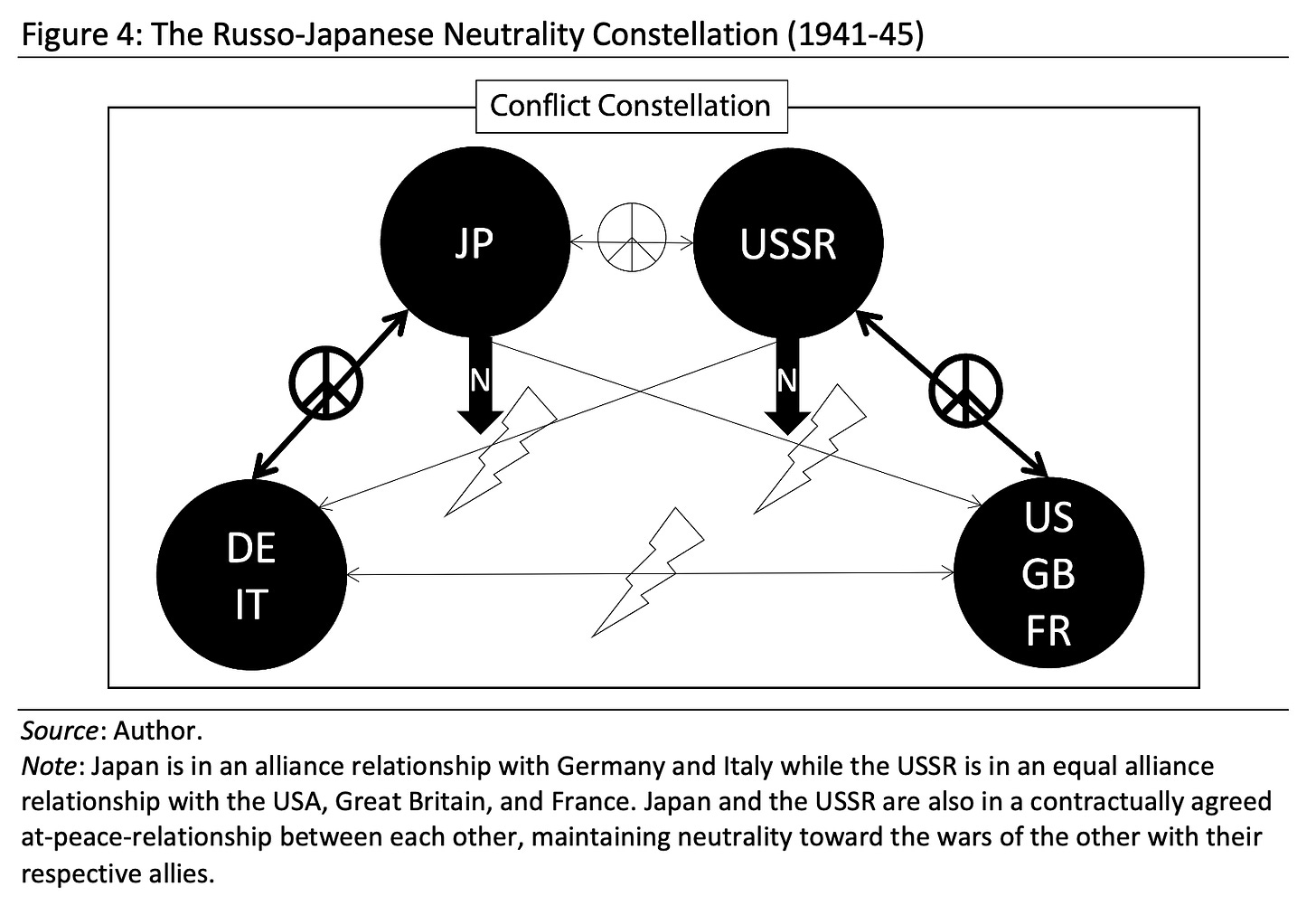 Note that this representation lumps together allies on both sides and, for simplicity's sake, ignores a few co-belligerents like China, Finland, or Romania. In this simplified model, Germany and Italy form one set of allies with which Japan is in a supportive at-peace-relationship, while Great Britain, France, and the USA form the other set with a supportive at-peace-relationship. The two alliances are in an at-war-relationship with each other, while, simultaneously, Japan finds itself in an at-war-relationship with the USA, Great Britain, and France, and the USSR is equally in an at-war-relationship with Germany and Italy. Among themselves, Japan and the USSR remain in an at-peace-relationship that gives rise to each one’s neutrality toward the other's at-war-relationship with their respective allies.