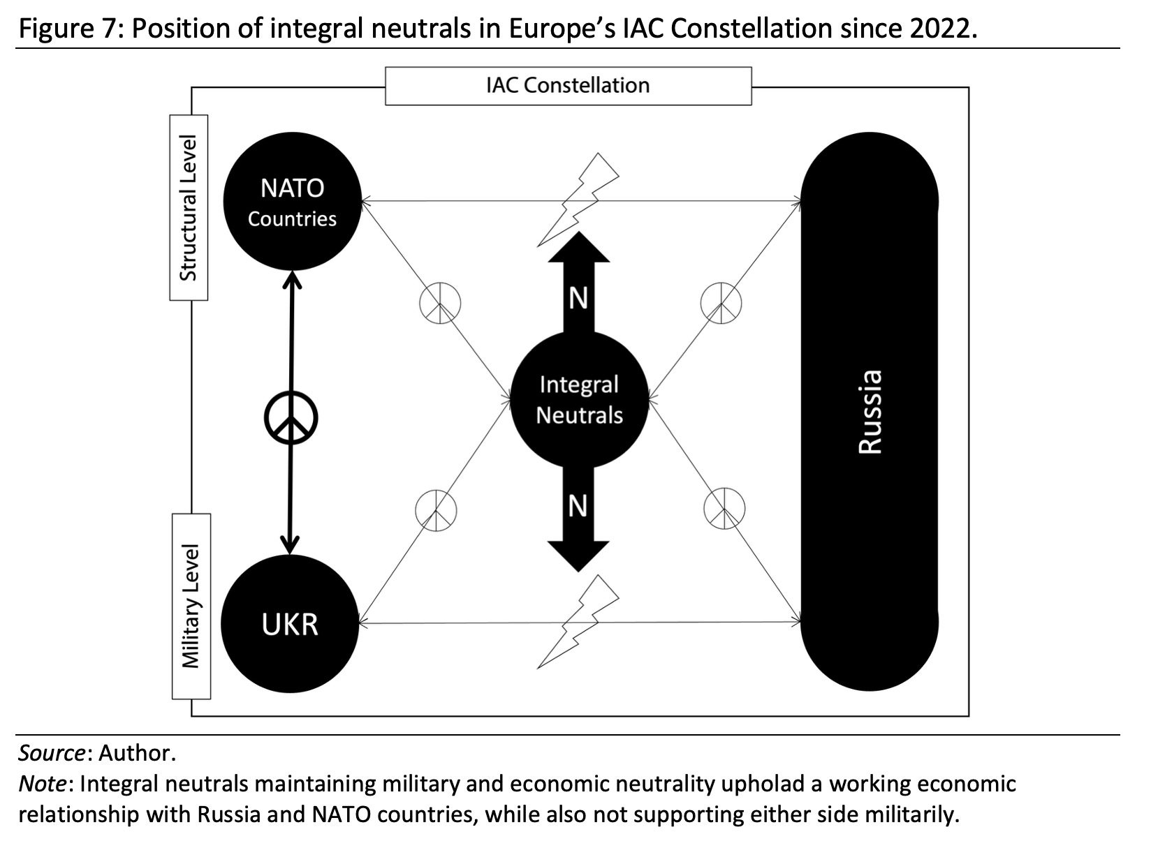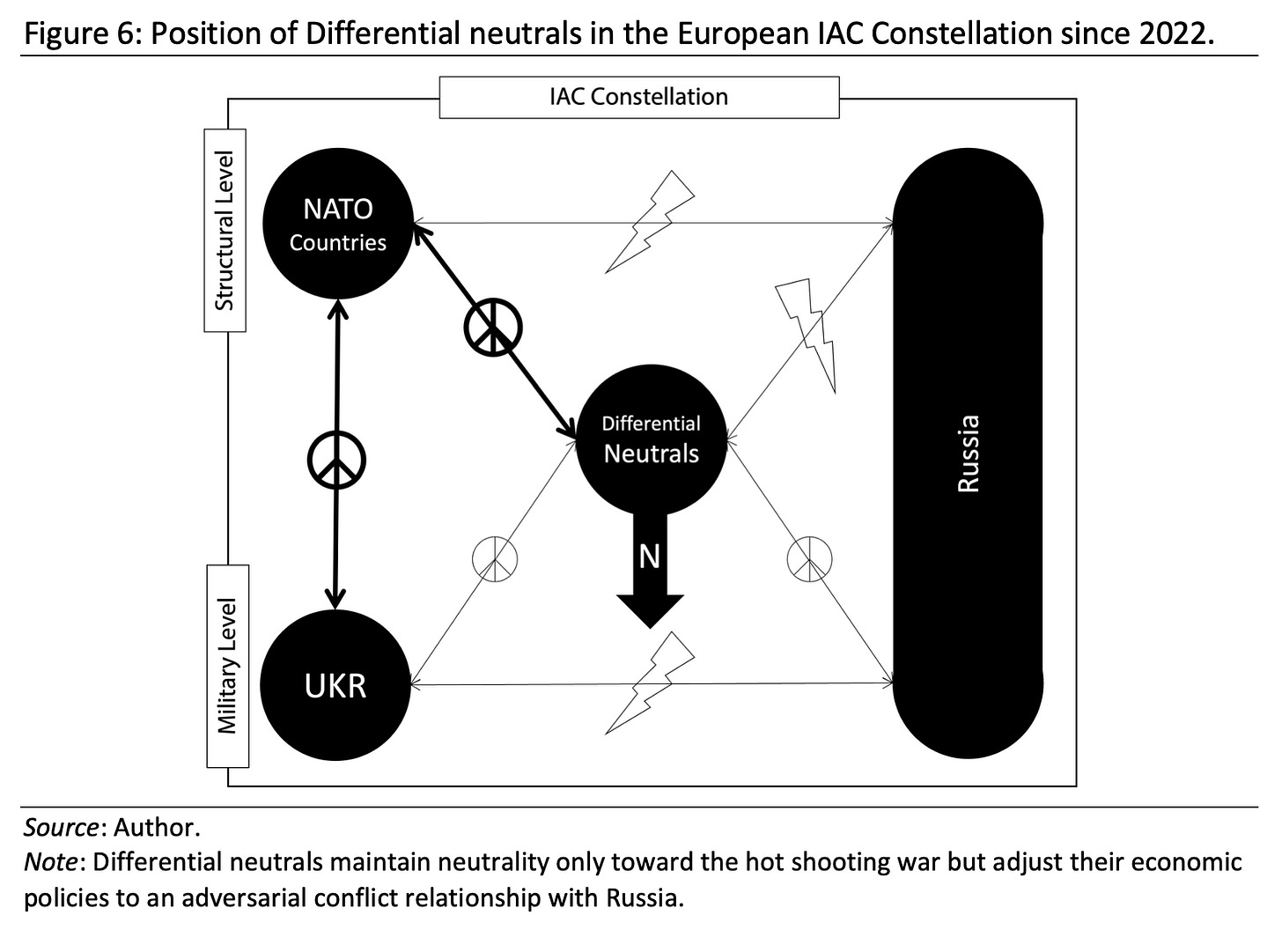 First, we can look at a category of countries that maintained military neutrality only—meaning that while they did not send weapons or other “lethal aid” to either side of the hot shooting war, they did, in fact, impose economic sanctions on the Russian side. Switzerland, Austria, and Ireland are examples of officially neutral states with neutrality clauses either in their constitutions or legal codes that belong to this category. Other states without neutrality policies could be added to this list, like Japan or South Korea. In the analytical sense of this paper, they implemented a differential neutrality toward the two conflict levels, shown in Figure 6.