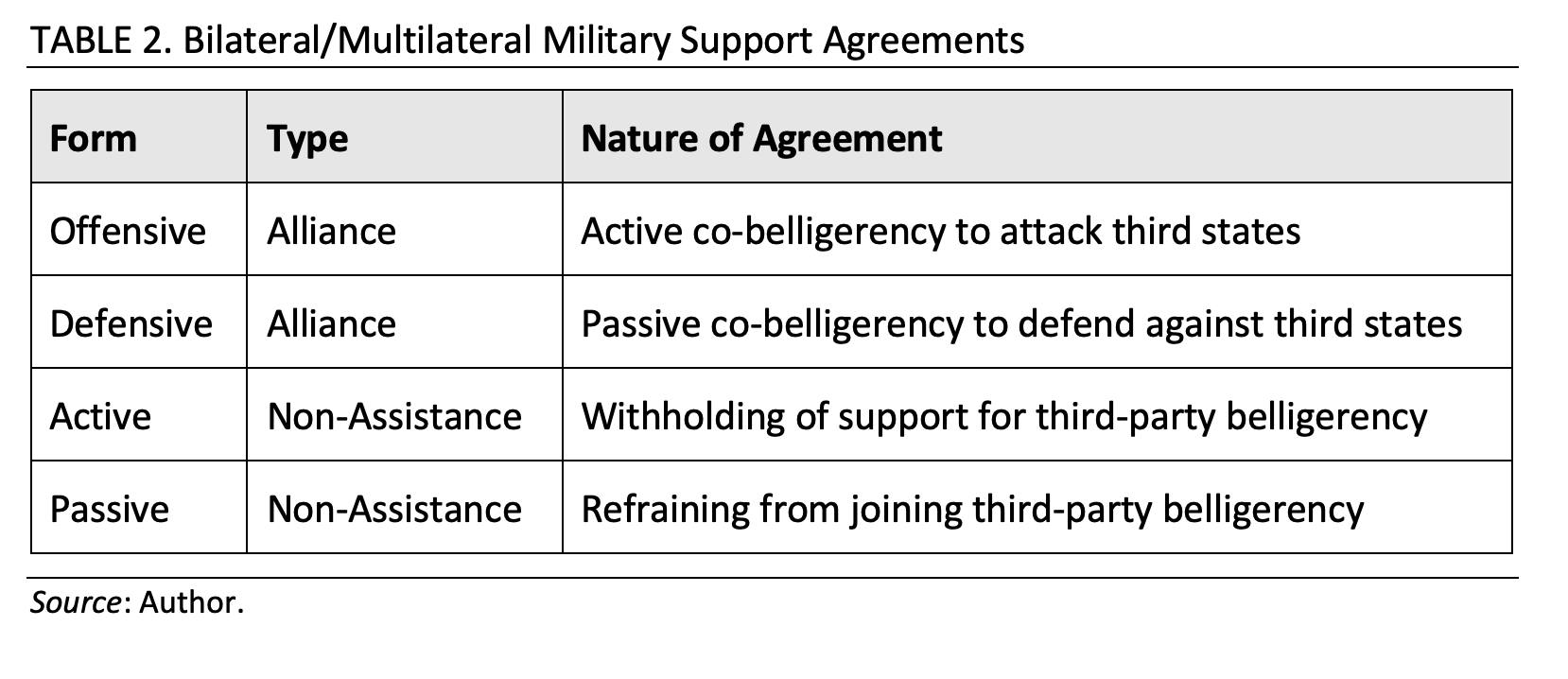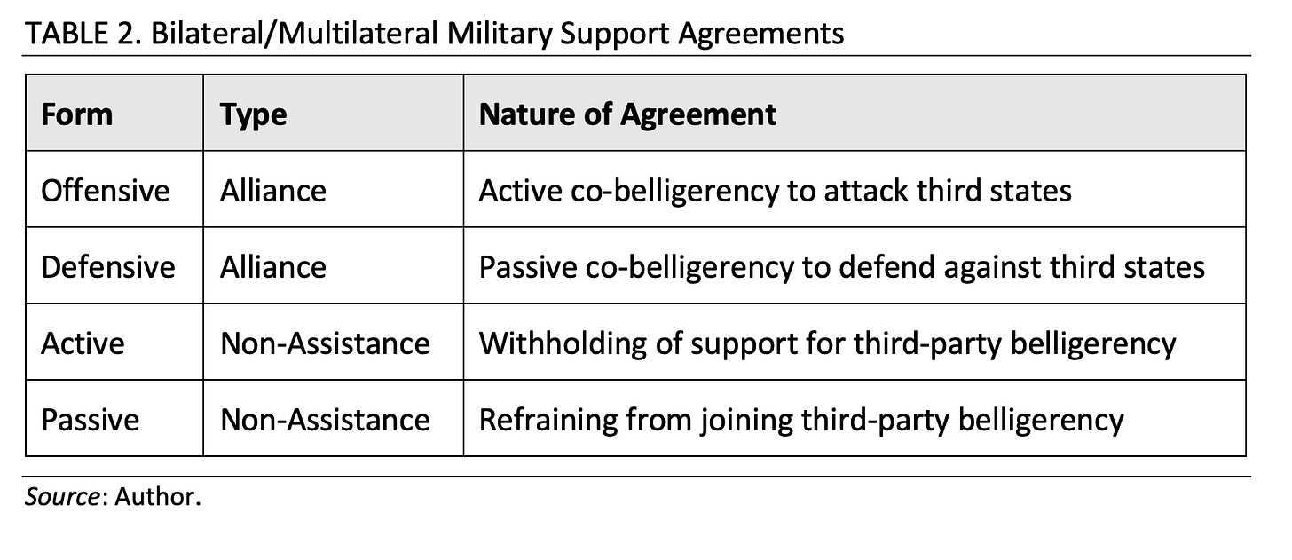 Lastly, there are passive non-assistance agreements in which the contracting parties agree not to join the warfare of third states against the other party but might reserve the right (explicitly or implicitly) to support such third-party war efforts. The Soviet-Japanese neutrality pact is the example here, as Stalin explicitly refused to grant Japan a German-style Nonaggression Pact, since he wanted to continue supporting the Chinese resistance effort against Japan, albeit with reservations.[47] He was, however, willing to promise not to join that war as an active belligerent. Table 2 is a summary of the four bilateral support agreement types.